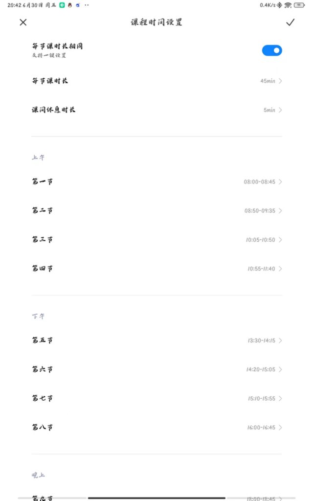 打开每节课时间相同(或手动设置每一节)